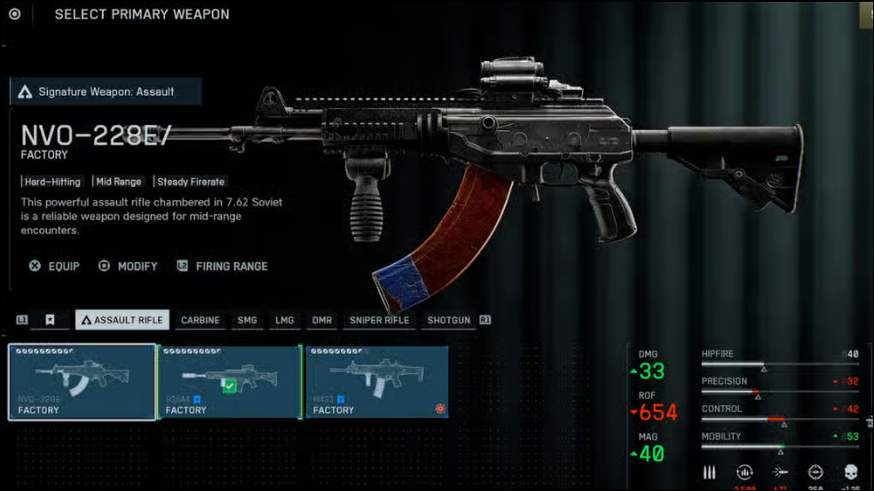 Step 1: Equip the NVO-228E as your main rifle. This weapon, unlocked at Career Rank 5, is known for its high rate of fire and manageable recoil when fitted with the right attachments. Attach a Compensated Brake to reduce recoil, a 409mm Fluted Barrel for improved bullet velocity, a Classic Vertical Grip for better control, a 30RND Magazine for sustained fire, and Polymer Case Ammo for a slight damage boost. For optics, use the CCO 2.00x for clear target acquisition.