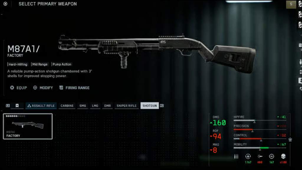 Step 2: For close-quarters, select the M87A1 shotgun as your secondary primary. This shotgun can secure one-shot eliminations within 15 meters. Attach a 5MW Green Laser to tighten hip-fire spread, use Buckshot Shells for maximum damage, and a Ribbed Stubby Grip to improve handling during rapid engagements.