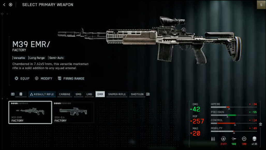 Step 3: On larger maps, consider swapping out the shotgun for a DMR like the M39 EMR. Use a Compensated Brake, 18" EBR Barrel, Polymer Case Ammo, and Canted Stubby Grip to maintain accuracy at range.