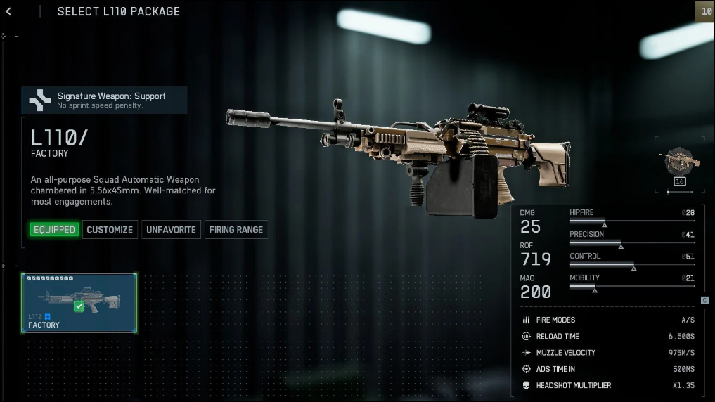 Step 1: For the L110, attach a Long Suppressor to stay off enemy radar, a 349mm Fluted Barrel to improve bullet velocity, a 100RND Belt Pouch for extended firing, Full Metal Jacket Ammo for increased penetration, and a Stippled Stubby Grip to stabilize sustained fire. This configuration allows you to suppress multiple enemies and control objectives efficiently.