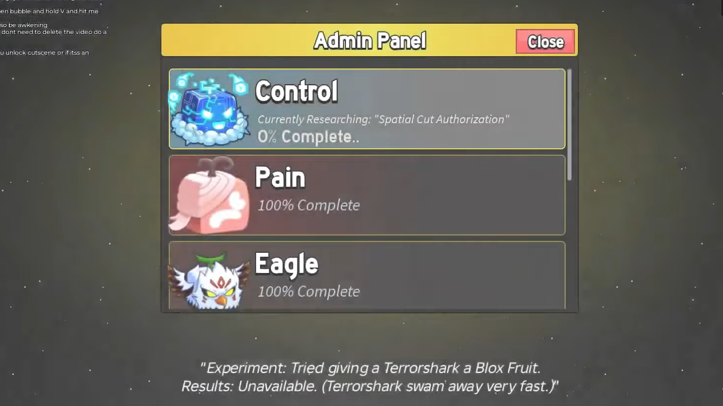 The earlier Admin Panel fruits—Gravity, Pain, Lightning, and Eagle—follow similar patterns, with mastery thresholds and Simulation Data gates. Control joins that list as one of the highest-value mythic fruits to receive the treatment.