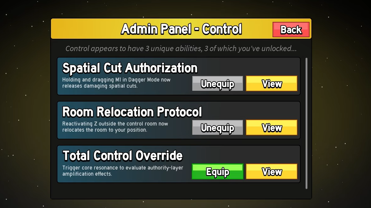 Once you meet the mastery requirement, complete the task, and pay the cost, the Admin Panel permanently unlocks a new ability or behavior for Control. You can do the quests over time; progress is not lost between sessions.