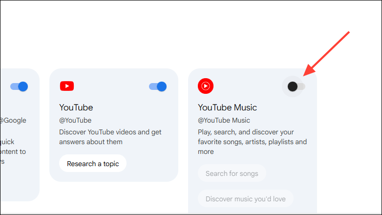 - Scroll down and you will see the YouTube Music extension. Click on the button on its right to enable it.