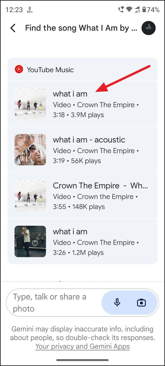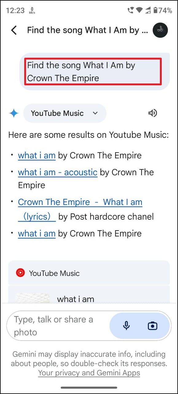 Find the song What I Am by Crown The Empireand ask Gemini to search for the song. - When the results appear, you can tap on any of the options to start playing the song in YouTube Music.
