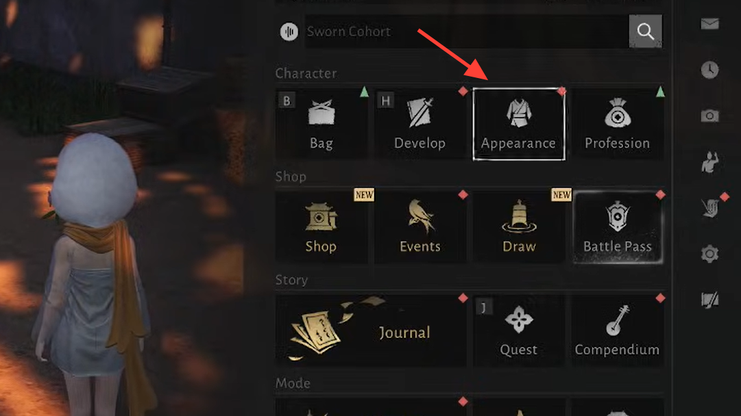 Step 1: Open the main menu with Esc and select Appearance. This takes you to the wardrobe screen.