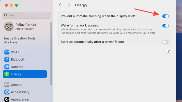 Step 2: Click "Energy" on the left and enable "Prevent automatic sleeping when the display is off." Additionally, set "Turn display off when inactive" to a short interval (1–5 minutes), ensuring your Mac doesn't sleep entirely.