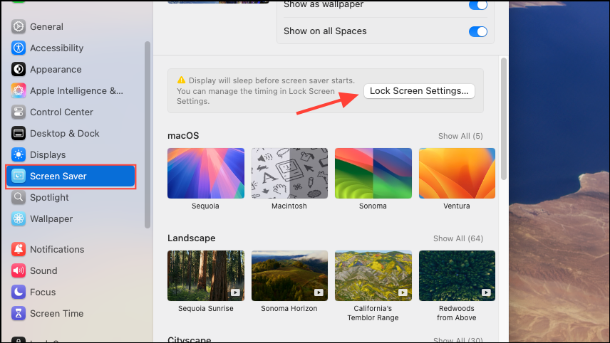 Step 3: Avoid disabling your screensaver via Hot Corners, since this can inadvertently pause Photos' background indexing processes. To do that, first click "Screen Saver" on the left and then click the "Lock Screen Settings" button on the right.