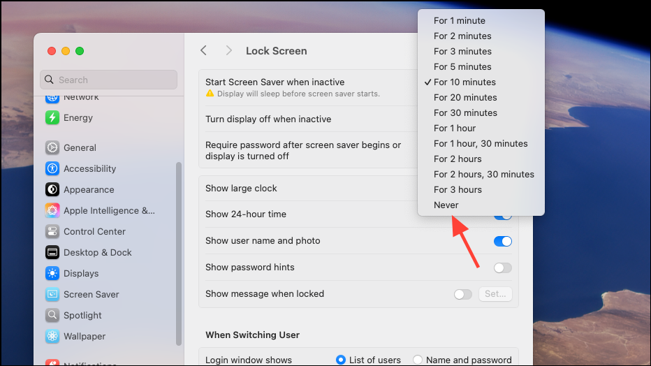 Step 4: Set the screensaver to "Never" in Lock Screen settings. This allows indexing to continue uninterrupted when your Mac is idle.