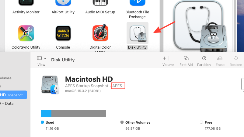 Step 2: Click "Disk Utility" and select your external drive from the sidebar. Then confirm the format is either APFS or Mac OS Extended (Journaled).