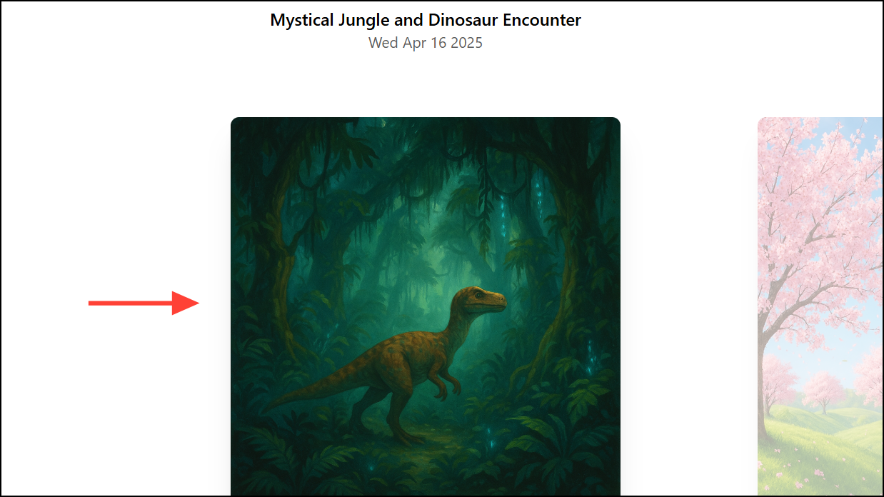 Step 3: Browse your gallery. Each image is shown as a thumbnail in a grid. Click on any image to open a larger view, where you can scroll through your collection carousel-style and see automatically generated titles for each image.