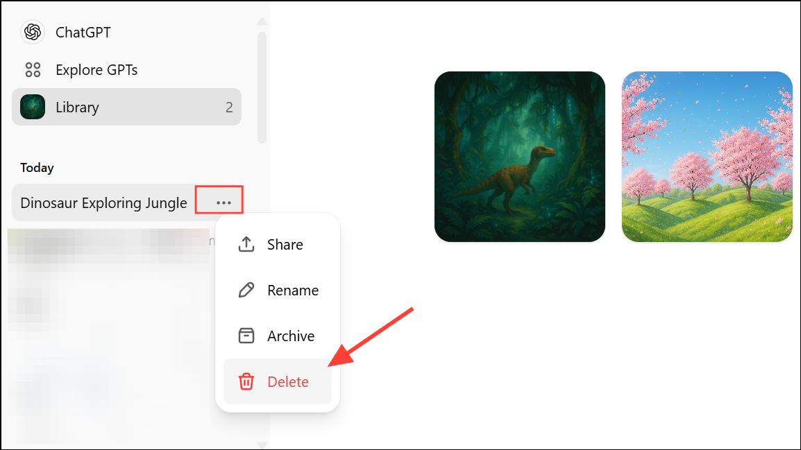 Step 1: To remove an image, you must delete the conversation where the image was originally created. The Library does not have a standalone delete button for individual images. On the web, hover over the conversation title in the sidebar, click the three dots (...), and select Delete. On mobile, press and hold the conversation title and tap Delete in the pop-up menu.