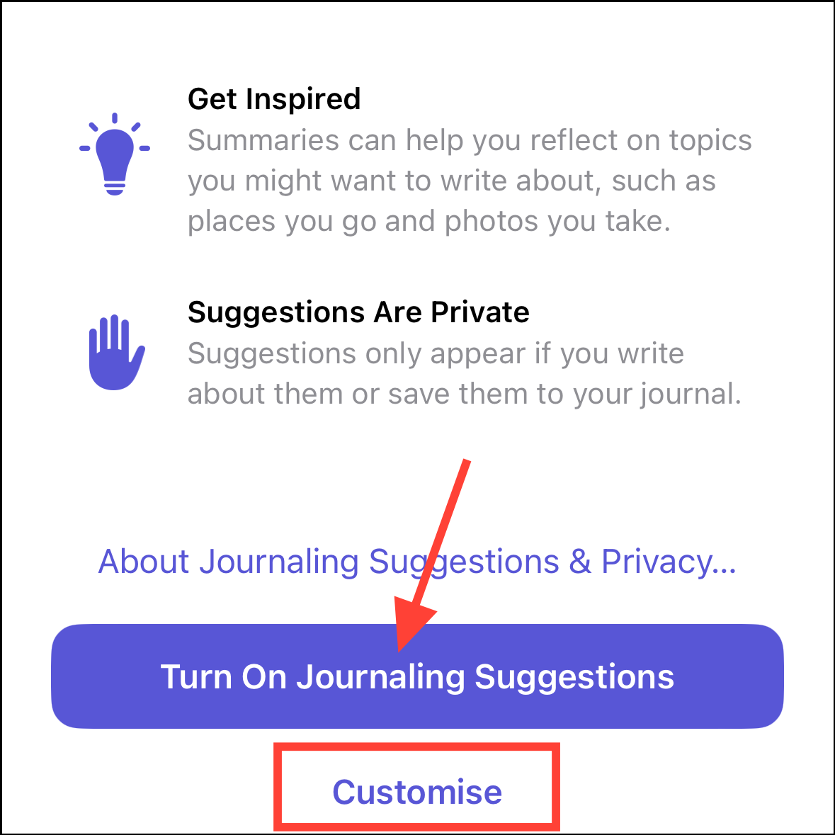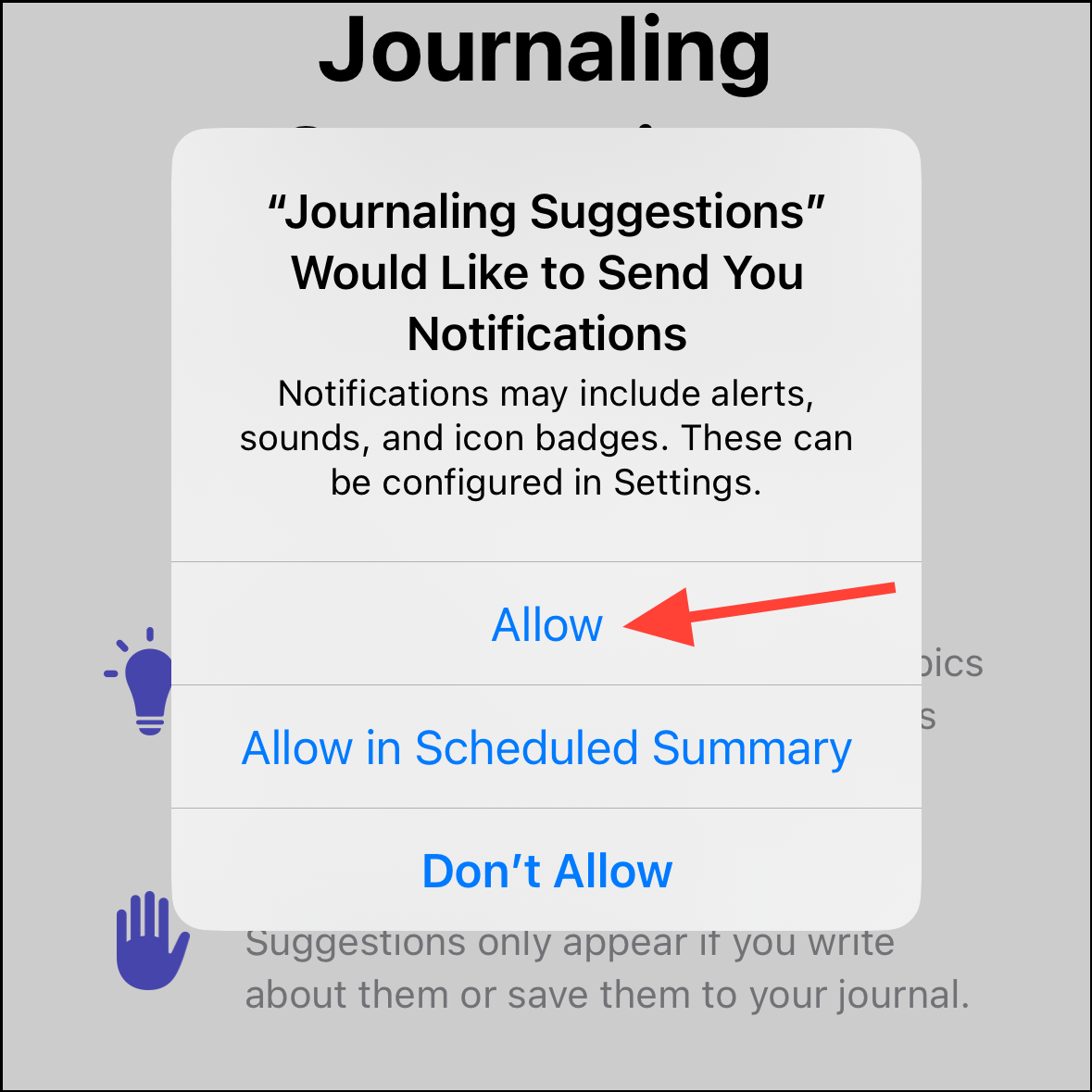 - Then, choose whether you want to receive notifications for journaling suggestions if you're enabling them.