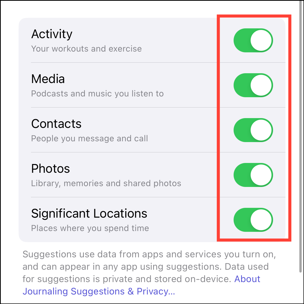 You have some control over what you want to appear in your suggestions, and you can even turn them off completely. Since all the processing happens on your device, you don't have to worry about your data not being local. Even with the Suggestions API, third-party apps won't have access to your Moments unless you pick it to add it in the app.