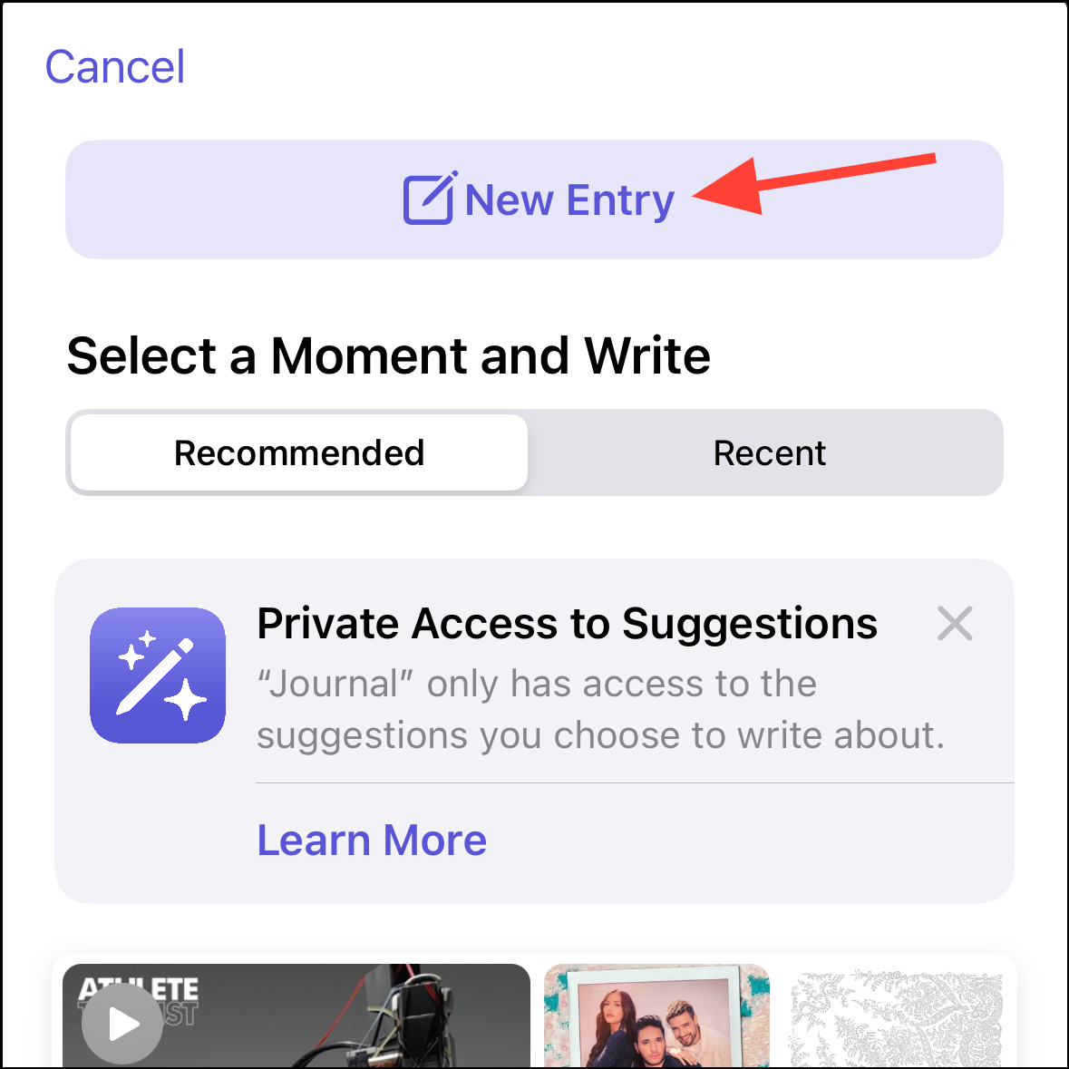 - To write without using a suggestion, tap on 'New Entry'. You can also skip journaling suggestions so they won't pop up every time.