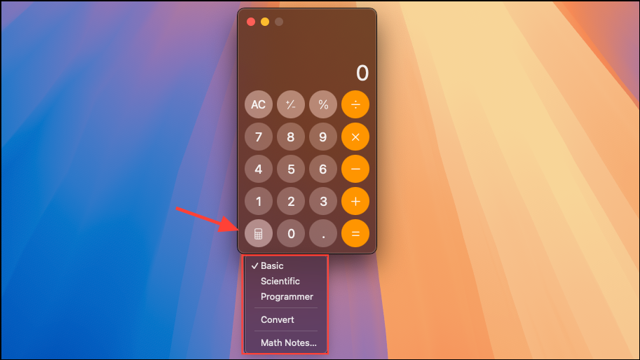 Step 2: Once the Calculator app is open, locate the small calculator icon situated in the lower-left corner of the window. Clicking this icon will reveal a popup menu displaying the available calculator modes.