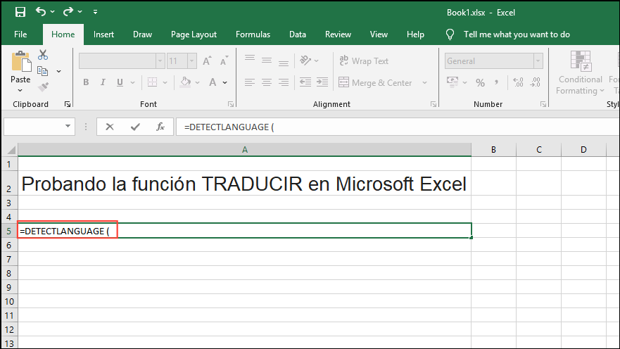- When you press Enter, Excel should show you the code of the language used in the cell. In this case, you should see 'es' for Spanish.