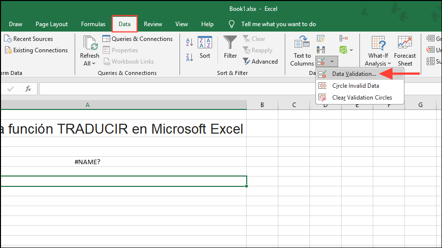 - Now, go back to Sheet 1 by clicking on it at the bottom left and select the cell where you want to create the dropdown. Then, go to the 'Data' tab at the top and then click on 'Data Validation'.