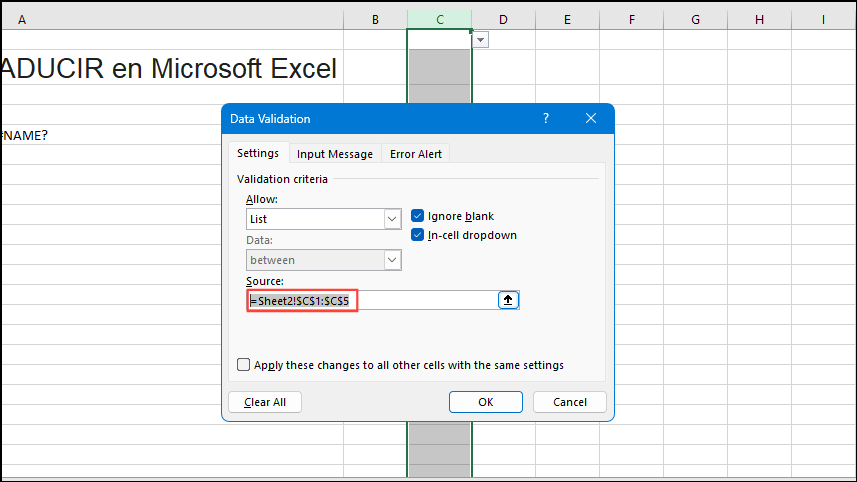 - In the Source field, select the cells containing the language translations in Sheet 2. Press Enter and a dropdown will be added in the cell you selected earlier, with the languages you added in Sheet 2.