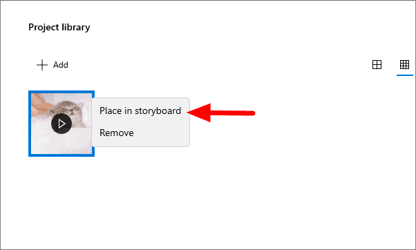 Once a video has is to your project library, right-click on it and select ‘Place in storyboard’ or you can drag and drop it to the ‘Storyboard’ to start editing.