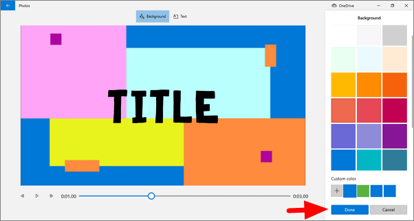 After you are done with the text, click on ‘Background’ at the top to change the background color. You can select a color from the list of options or choose a custom one by clicking on the ‘+’ sign at the bottom. Click on ‘Done’ when you have set up the title card.
