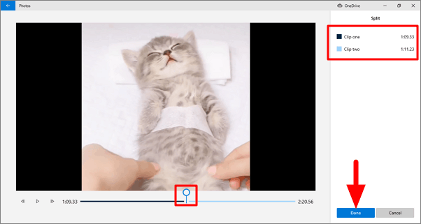 With the Split tool, you can divide the video into two parts. To split a video, slide the pointer to a time where you want to split the video. If you are unsure about the time of the split, hit the play button, identify the split point, hit pause, and then click on ‘Done’ to split the video.