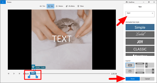 Like the title card, text can be added to a video as well. Enter the text you want to add in the box on the top-right corner, select the text style from the options underneath it, and then select the layout of the text at the bottom.