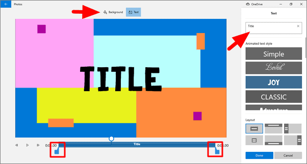 If you click on ‘Text’, add the title in the box in the top-right corner. You can also select a text style from the list of options on the left. Moreover, you can change the layout of the text by selecting one from the layout section at the bottom right. Also, you can set the time of display of text in the title card by adjusting the pointers.