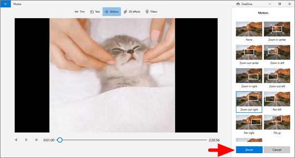 After you have selected a motion effect, you can preview it before making the changes. To preview, hit the play button and see how the effect works on your video. If you are content with the motion effect, click on ‘Done’ to save the changes.