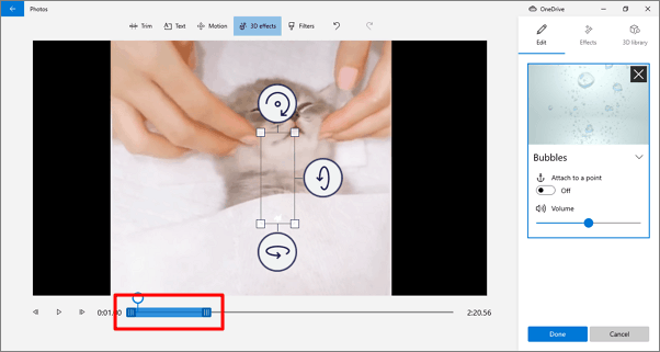 After selecting an object, you can adjust not just its position in the video but the orientation as well. To change the orientation, use the three curved arrows around the object. As was the case with other effects, you can set a time of display for the 3D object as well by adjusting the pointers.