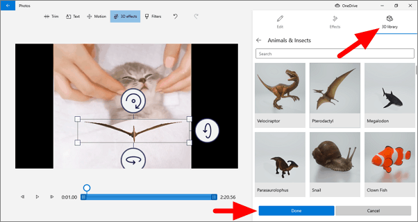 The Video Editor also allows you to add 3D objects to the video. Head to the ‘3D library’ section on the top-right and select a category. There are various objects under each category, thus providing you a multitude of options.