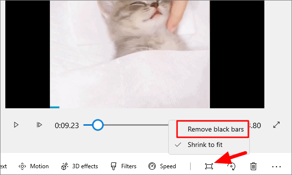 The second last tool in the storyboard toolbar is ‘Remove or Show Black bars’. There are two options in this tool, remove black bars and shrink to fit.