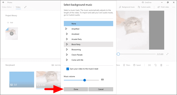 You can now select a music track to add as background music. Hit the play button right behind the music track to listen to it before making the selection. Click on ‘Done’ at the bottom once you have selected the music track.