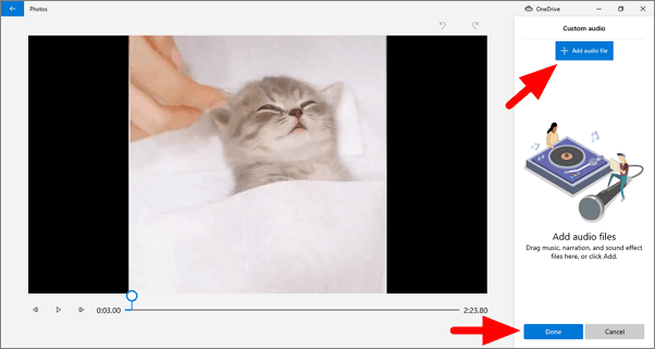 Click on ‘Add a file’ under custom audio, browse and select a track on your system and then click on ‘Done’.