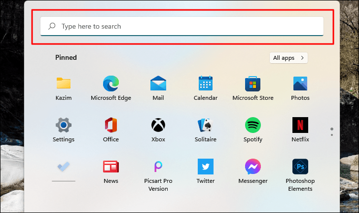 The Start menu includes a search bar at the top, making it easy to find apps, files, and settings. There's no need to click the search bar; you can start typing immediately after opening the Start menu.