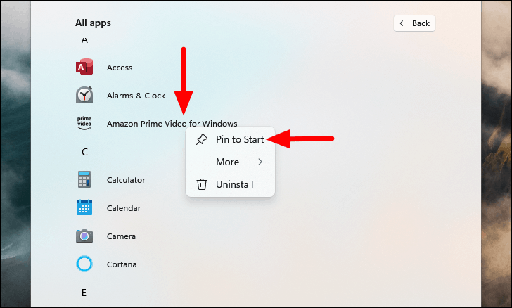 - Right-click on the app and select Pin to Start.