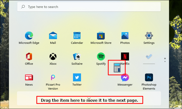 You can also move items across pages by dragging them to the bottom of the Pinned section and waiting for the page to change.