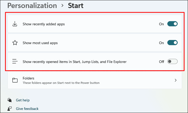 The "Recommended" section displays recently added apps and frequently used or recently opened items, helping you quickly access them. You can customize what appears in this section: