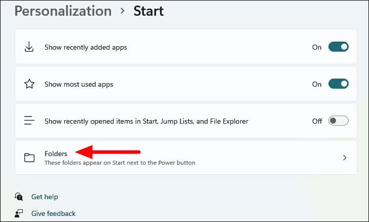 - In the Start menu settings, click on Folders.