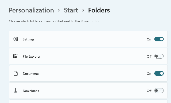 - Toggle on the folders you want to appear in the Start menu, such as Settings, Documents, or Downloads.