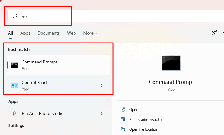 For example, to find the Command Prompt, you can type a part of its name, such as "pro," and Windows will display related results.