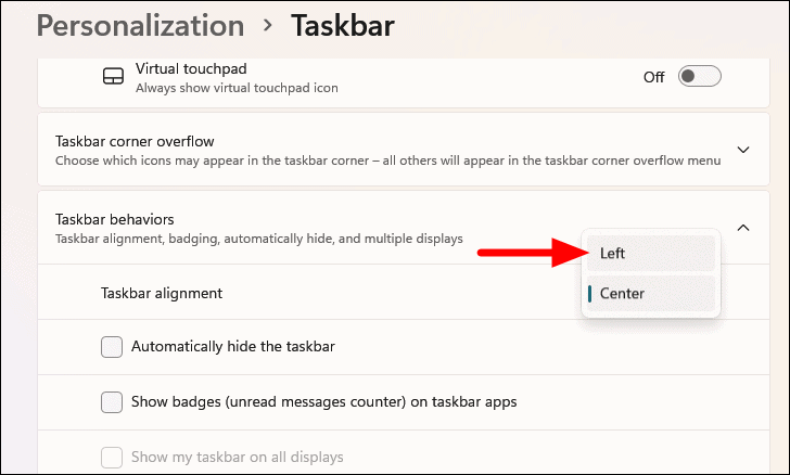 - Under Taskbar alignment, select Left from the dropdown menu.
