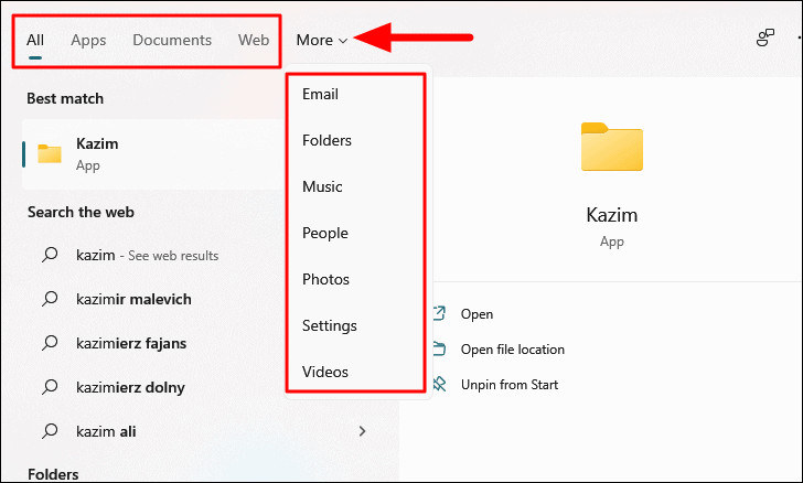 You can refine your search by selecting a specific category at the top, such as Apps, Documents, or Web. Click on "More" to see additional categories and narrow down your search results.