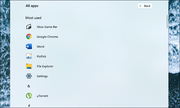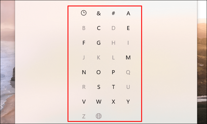 If you prefer not to scroll, click on any of the alphabet letters or symbols above the app sections to bring up an index of letters. Select the first letter of the app's name to jump directly to that section.