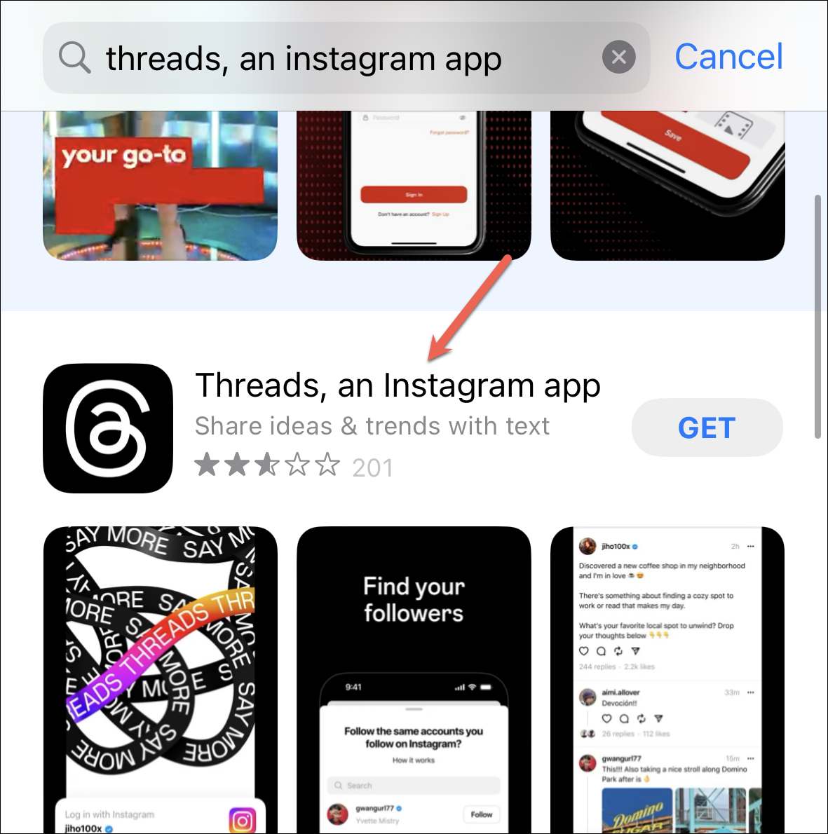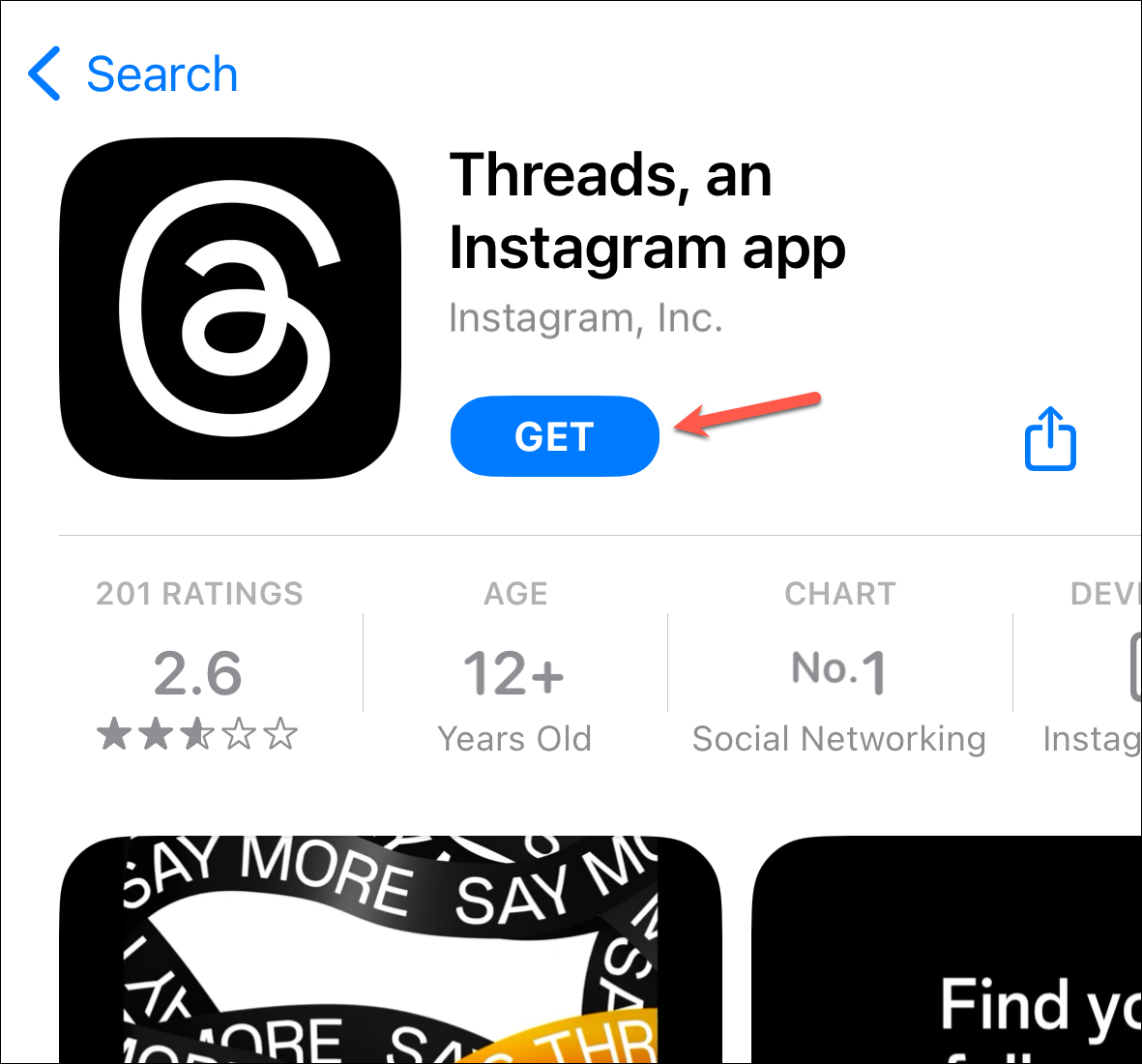 Go to the App Store and search for 'Threads'. Open the listing for 'Threads, an Instagram app'.