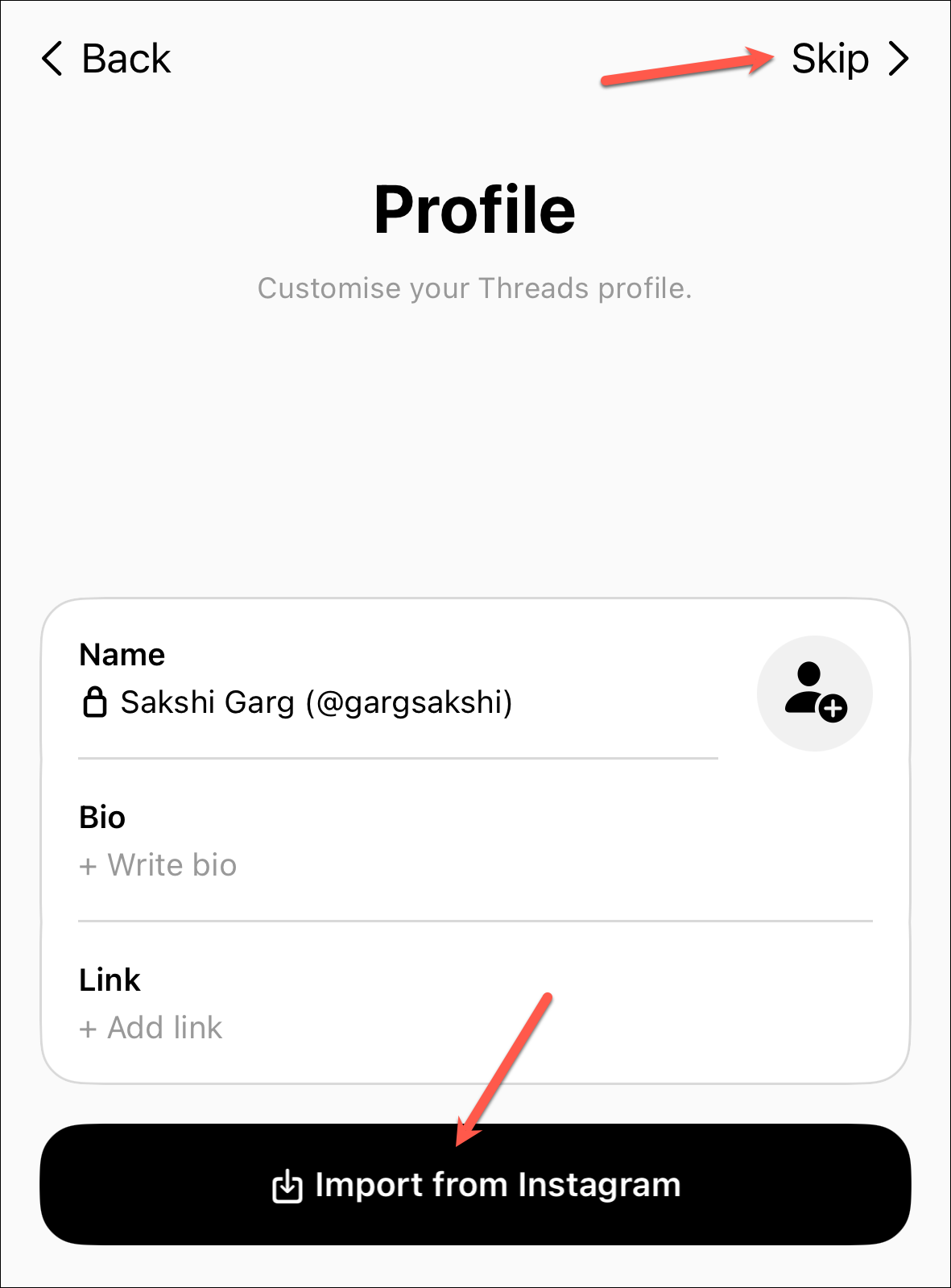 Next, you have the option to either import your Instagram bio to set up your Threads profile or you can customize it. You can also tap 'Skip' in the upper-right corner of the screen and set it up later.