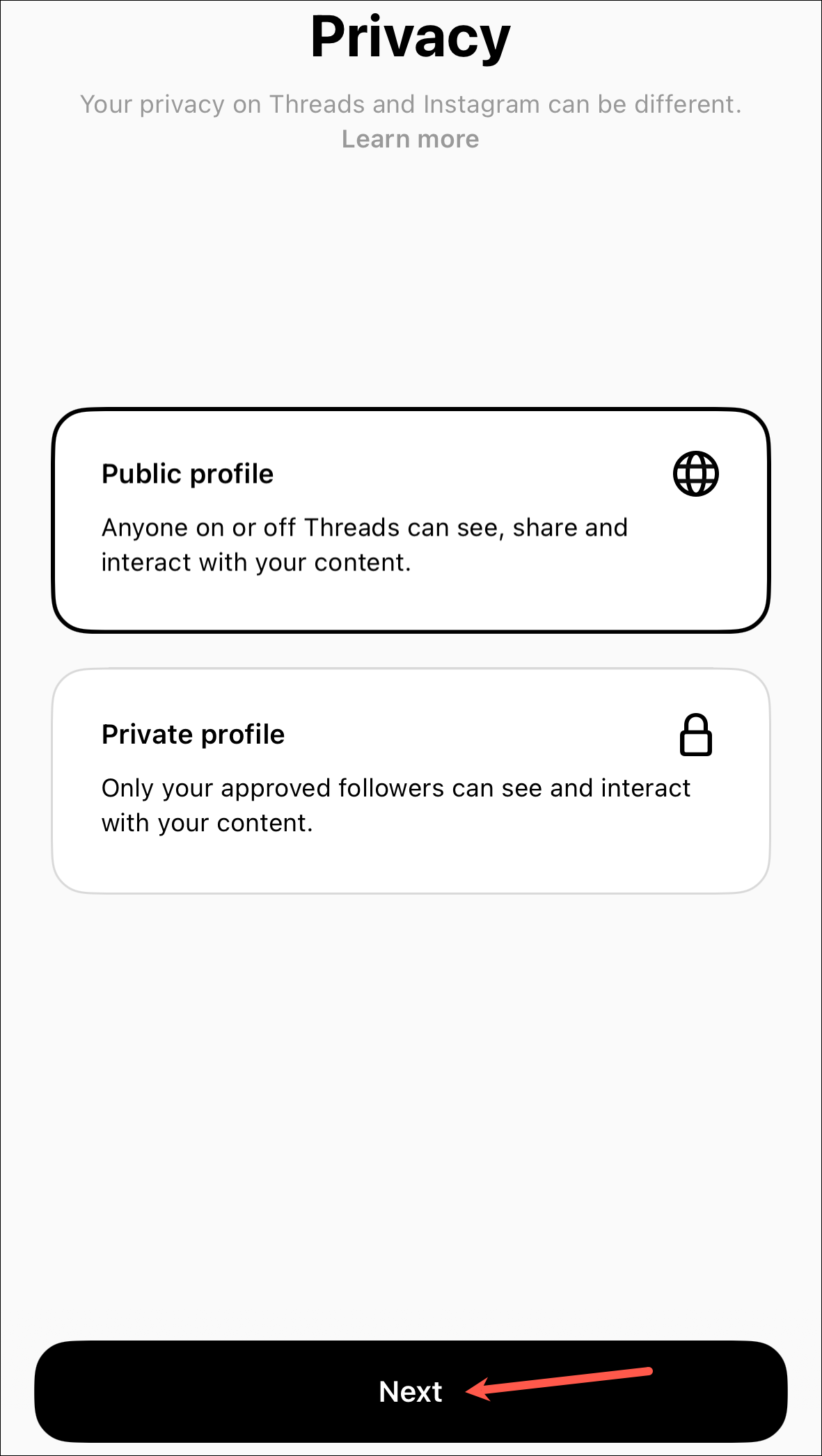 Then, choose whether you would like your account to be private or public and tap 'Next'. If you're under 16 years old (or 18 in some countries), your Threads profile will be private by default.