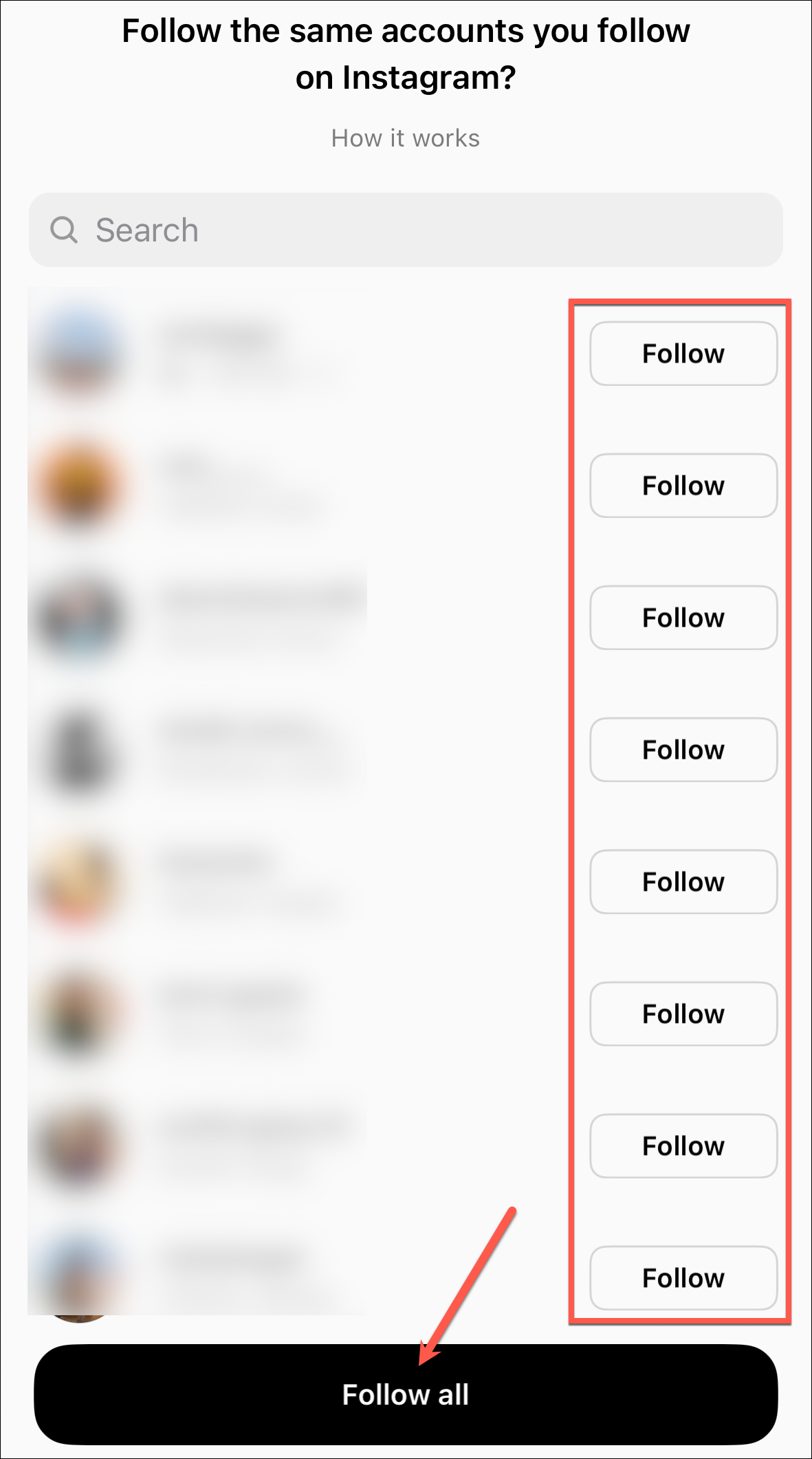 Now, you can even choose to follow all the accounts you do on Instagram. Tap 'Follow all' to follow all the accounts, or individually tap 'Follow' next to the users you want to follow. Some (or a lot) of these users might not be on Threads yet as it's just launched. But if you do give them a follow now, their Threads account will automatically receive you as a follower when they set it up.