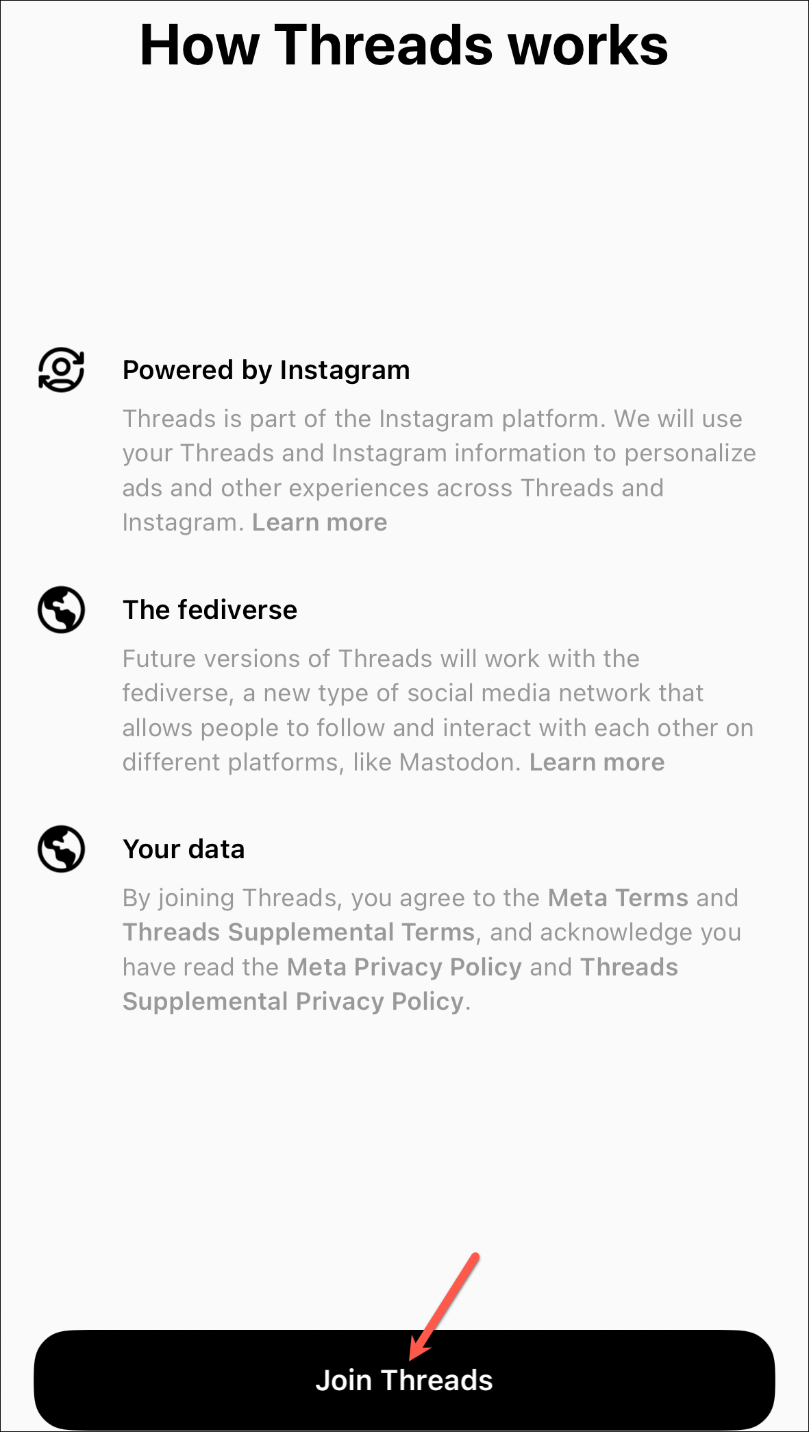 Finally, all that's left is a last onboarding screen that details how Threads works and how it will use your data. Tap 'Join Threads' to complete the account setup.