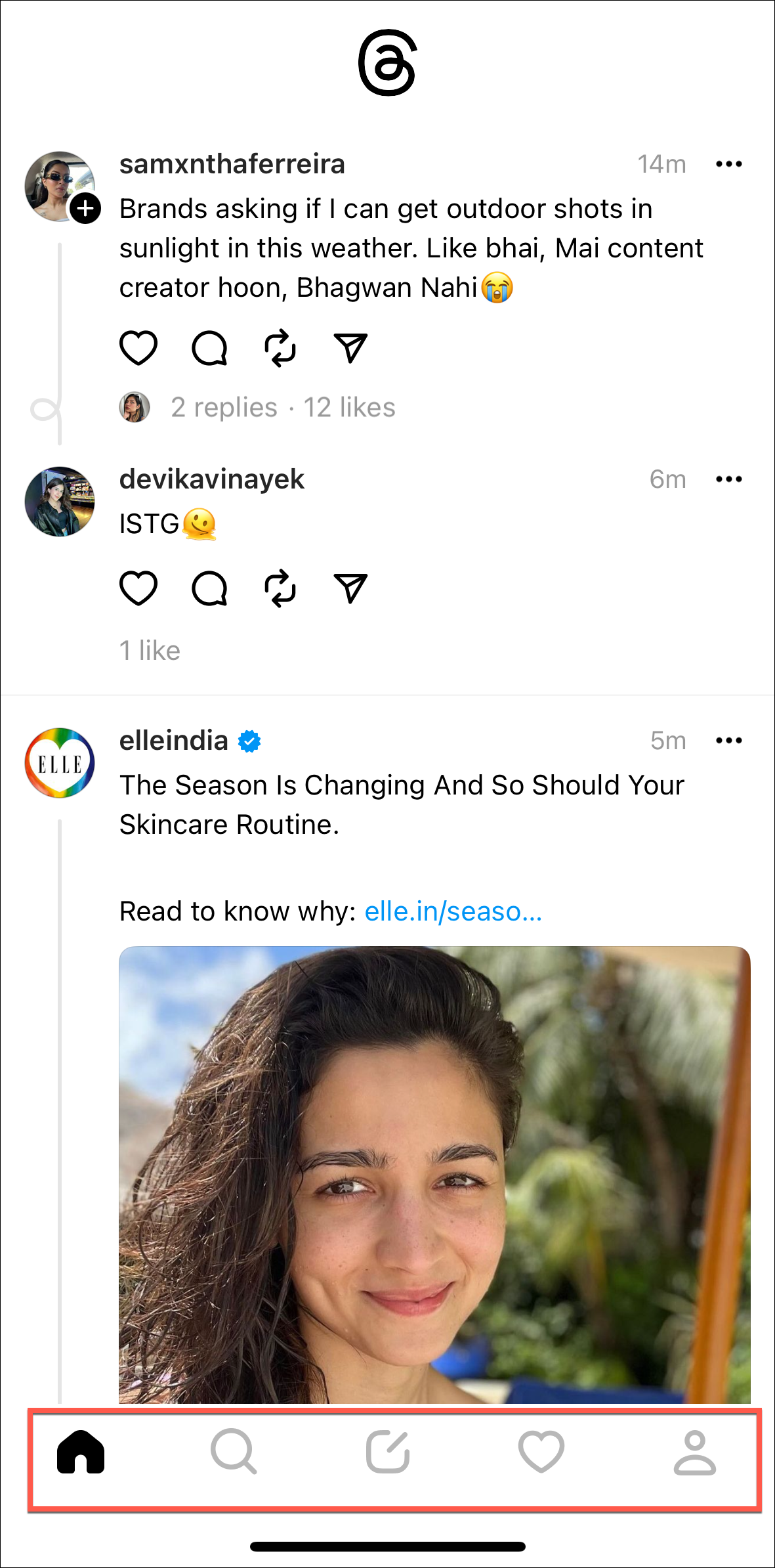 Open the app, and you'll reach your feed, where you can see threads from users you follow and also some random suggested followers. To help differentiate, the users that you don't follow will feature a '+' icon next to their display picture. The bottom bar houses the icons to help you navigate the app; the interface is similar to Instagram and won't be difficult to get a handle on.
