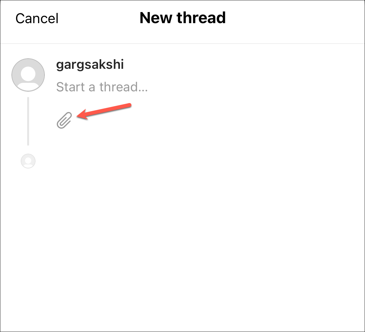 An overlay screen to create a new thread will appear. One thread can only have 500 characters; if it's more than that, it will automatically create another thread. To add a photo or a video to the thread, tap the 'Paper clip' option. You'll need to give Threads access to your library or selected photos/ videos to post them.
